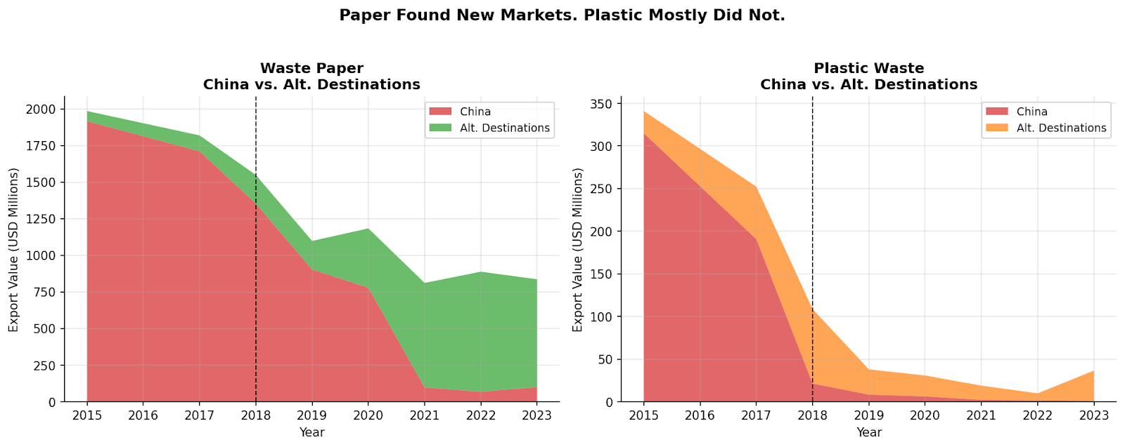 .Looking at a broader geographic sampling of material flows, I found that paper exports were temporarily diverted to Southeast Asia countries like Thailand and Vietnam. This is because recycled paper waste exports are more usable than plastics, as paper fibers can be recycled up to 5 to 7 times to make new paper. Plastics - even after decontamination - can only be reused once or twice before it degrades.