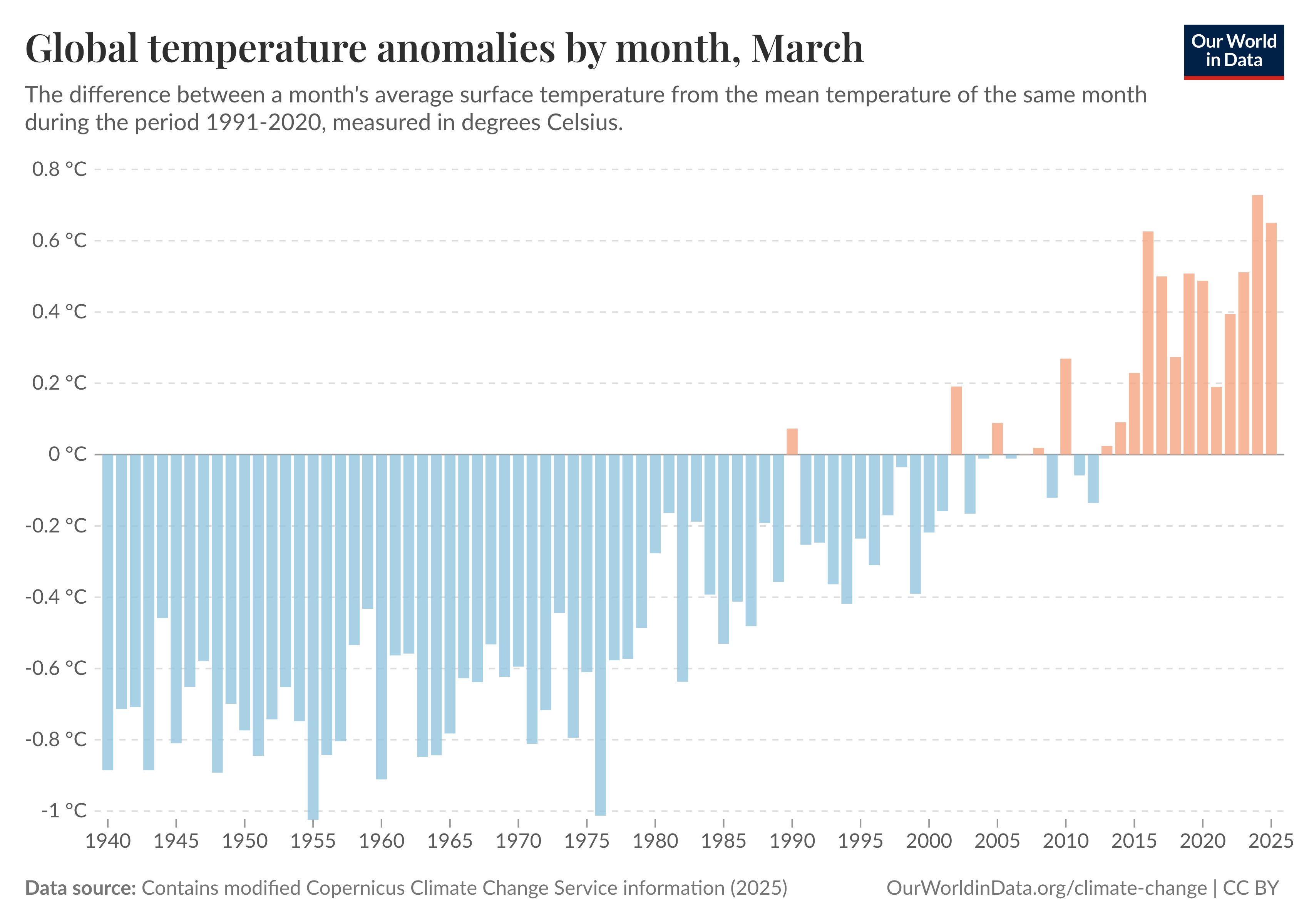 The shift is visible. March temperatures, once consistently below baseline, are now persistently above it. March 2026 was the second warmest March on record — another data point in what is increasingly a structural trend, not a series of outliers.