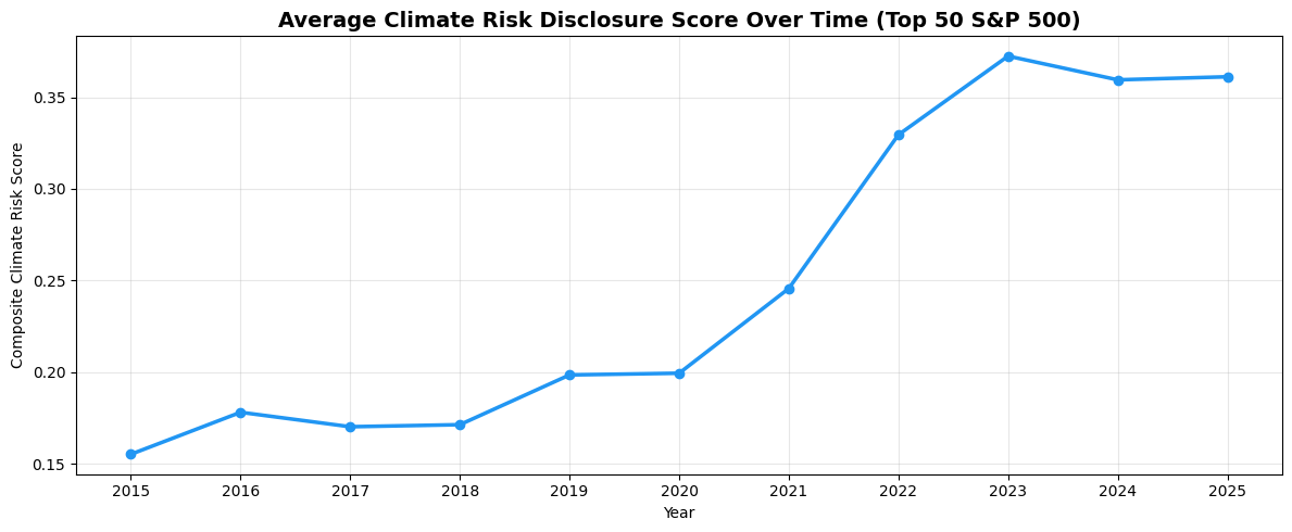 Using a sample of S&P 500 10-K annual reports filed between January and March 2026 scraped from the SEC EDGAR API, and comparing to equivalent filings from 2024 and 2025, I track the per-10,000-word frequency of six key terms: "climate risk," "transition risk," "physical risk," "Scope 3," "net zero," and "carbon pricing." A meaningful decline across multiple terms would suggest companies are quietly pulling back on voluntary climate language. Stability or growth would suggest the opposite — that institutional investor expectations are keeping disclosure norms in place despite regulatory retreat.